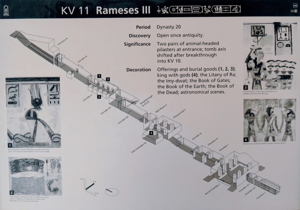 Valley of The Kings Details KV9 Ramses 5 and 6 This tomb has a slightly sloped entrance to its main corridors. you will then be greated by a small chamber with four pillars inside. As you continue into the tomb you will walk through additional sloped corridors and then you will reach the burial chamber […]